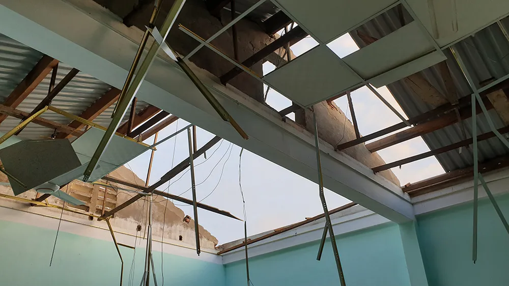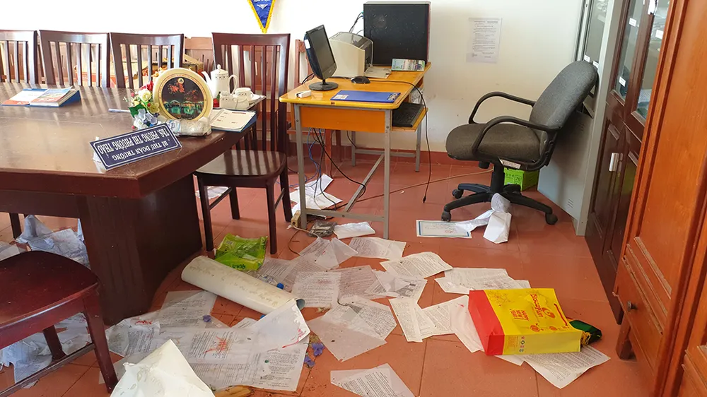 Trường tiểu Học Đông Hiệp ở xã Nghĩa Hiệp, huyện Tư Nghĩa bị tốc mái hoàn toàn, nước mưa làm ướt hết đồ đạc, trang thiết bị bên trong. Ảnh: Tân Toàn