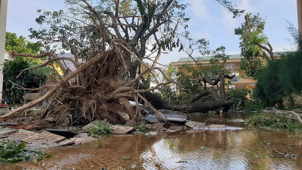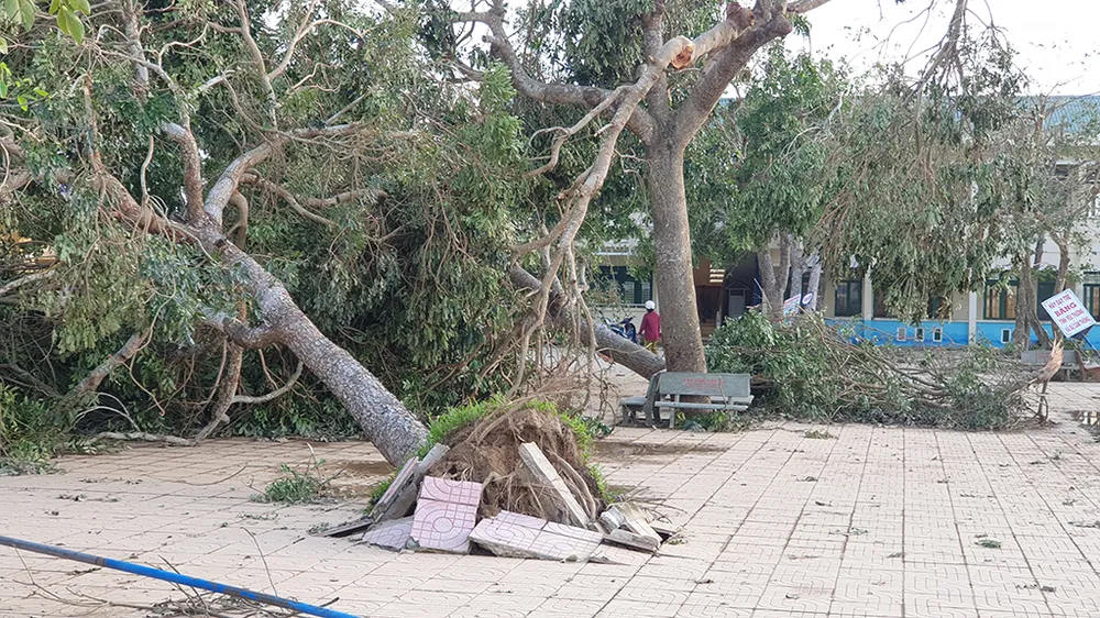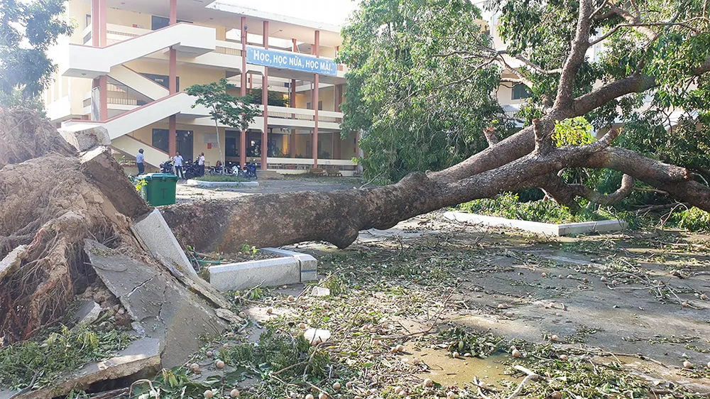 Cây cổ thụ hàng chục năm tuổi trong khuôn viên trường Đại học Phạm Văn Đồng bị gió bão quật ngã. Ảnh: Tân Toàn