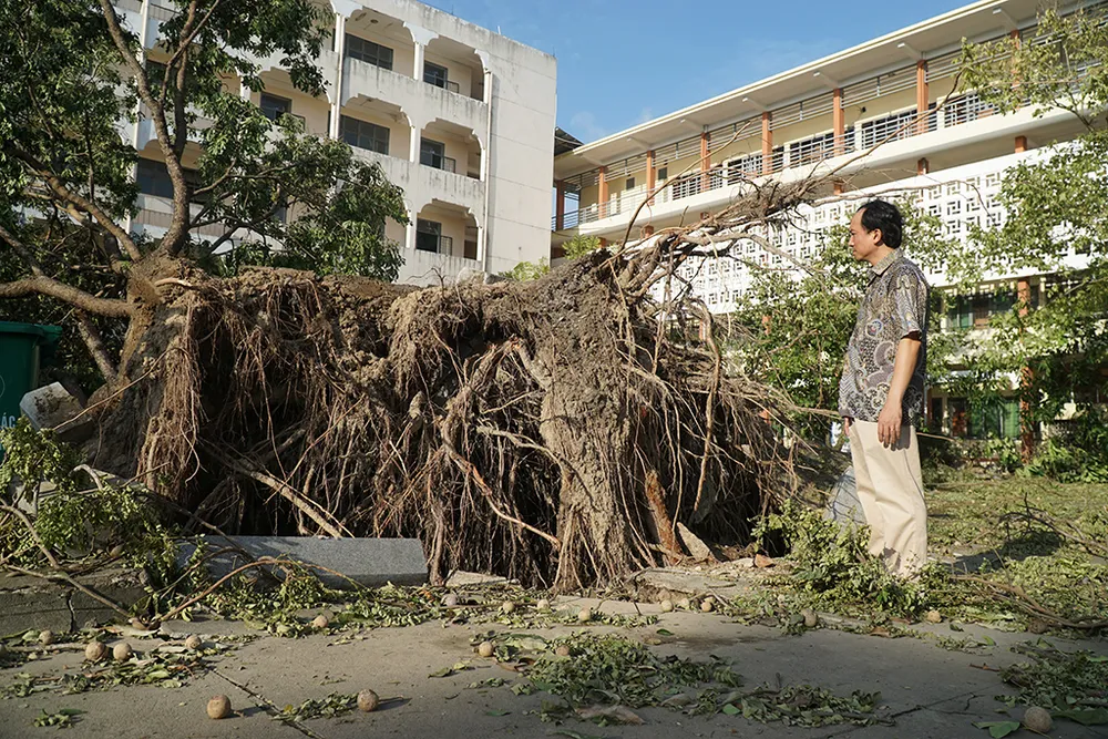 "Trước mắt chúng tôi huy động nhiều thầy cô giáo trong trường với tinh thần chủ động khắc phục thiệt hại sau bão trước, sau đó sẽ kêu gọi các nguồn lực sau. Từ đây đến cuối tuần, chúng tôi sẽ cố gắng khắc phục càng sớm càng tốt, dọn dẹp sạch sẽ, sắp xếp lại chương trình dạy học nhằm đảm bảo đúng tiến độ chung theo quy định của bộ GD ĐT" - ông Thám nói. Ảnh: Tân Toàn
