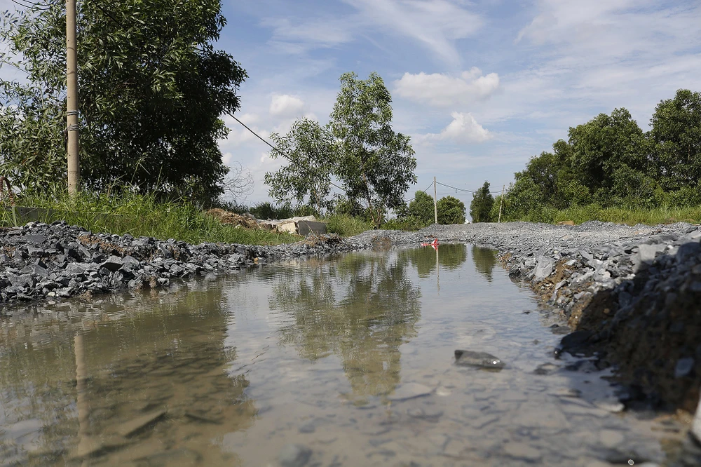 Trên đoạn đường thuộc tuyến cuối dự án, nhiều chỗ trũng nước, san lấp chưa bằng phẳng.