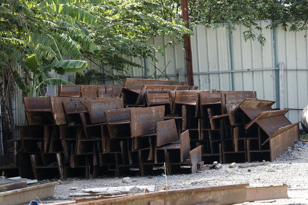 Bên trong nhà công trường không ai trông nom, chỉ che chắn bằng rào sắt, cốt thép để ngoài trời bị hoen rỉ.