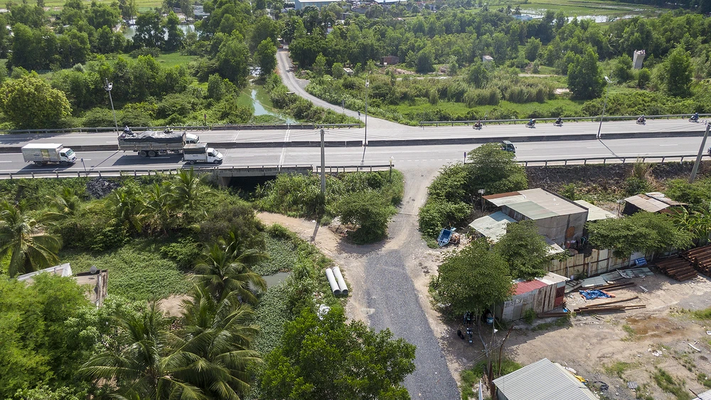 Là tuyến đầu của sự án, nút giao với quốc lộ 1 - Võ Văn Kiệt đang trong tình trạng thi công đứt quãng. Công trình không có rào chắn, không thấy máy móc, công nhân, bảng thông tin công trình cũng không có.
