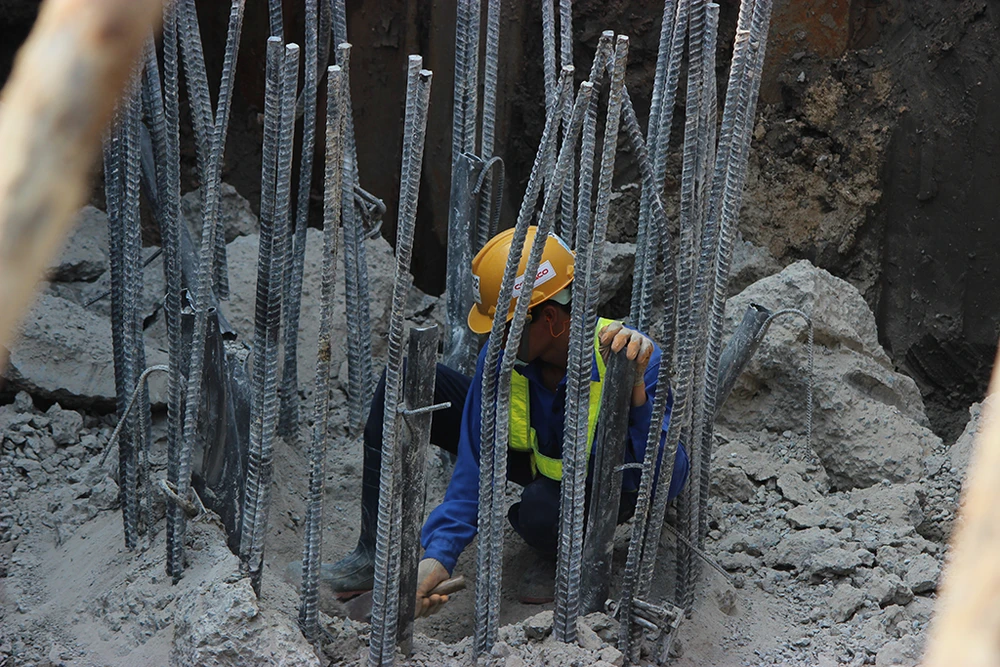 Bới đá trong các vòng sắt dưới hố trụ để chuẩn bị xây trụ lên cao