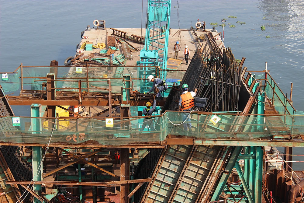 Cầu vượt sông dành cho Metro cách cầu Sài Gòn 38 m về phía thượng lưu, rộng hơn 11 m, được thiết kế 2 chiều Metro đi và về. Trong ảnh: Các công nhân đẩy nhanh tiến độ thi công cầu vượt metro sông Sài Gòn dài 267,5 m