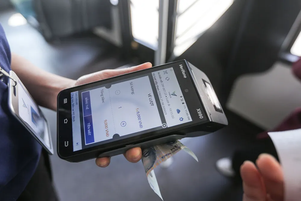 Khi mua vé trực tiếp trên xe buýt điện VinBus, hành khách có thể lựa chọn sử dụng thẻ chip nội địa không tiếp xúc từ các ngân hàng.