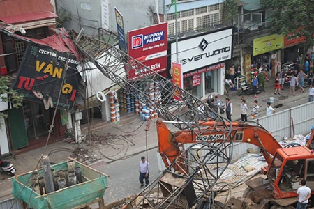 Theo nhân chứng, vào thời điểm trên cần cẩu đang hoạt động thì bất ngờ đổ ập xuống, đầu cần cẩu gác lên mái nhà, các dây cáp rơi xuống đường. Đúng lúc này, hai người đi trên hai xe máy bị vướng vào dây cáp ngã xuống đường. Trong số 2 nạn nhân, có một phụ nữ đang mang thai bị thương được người dân nhanh chóng đưa đến bệnh viện, thanh niên còn lại bị xây xát nhẹ. Anh Nguyễn Văn Hùng, nhân chứng cho rằng, nếu vào thời điểm trên phía trước không có đèn đỏ thì tai nạn còn khủng khiếp hơn.