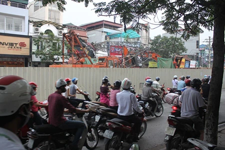 Sập cần cẩu khiến giao thông bị tắc cục bộ. Ảnh: VIẾT LONG