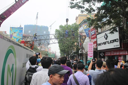 Hiện trường xảy ra vụ sập cần cẩu tại tuyến đường sắt đô thị Nhổ - ga Hà Nội. Ảnh: VIẾT LONG
