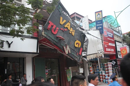 Bảng hiệu bị đổ sập. Ảnh: VIẾT LONG.