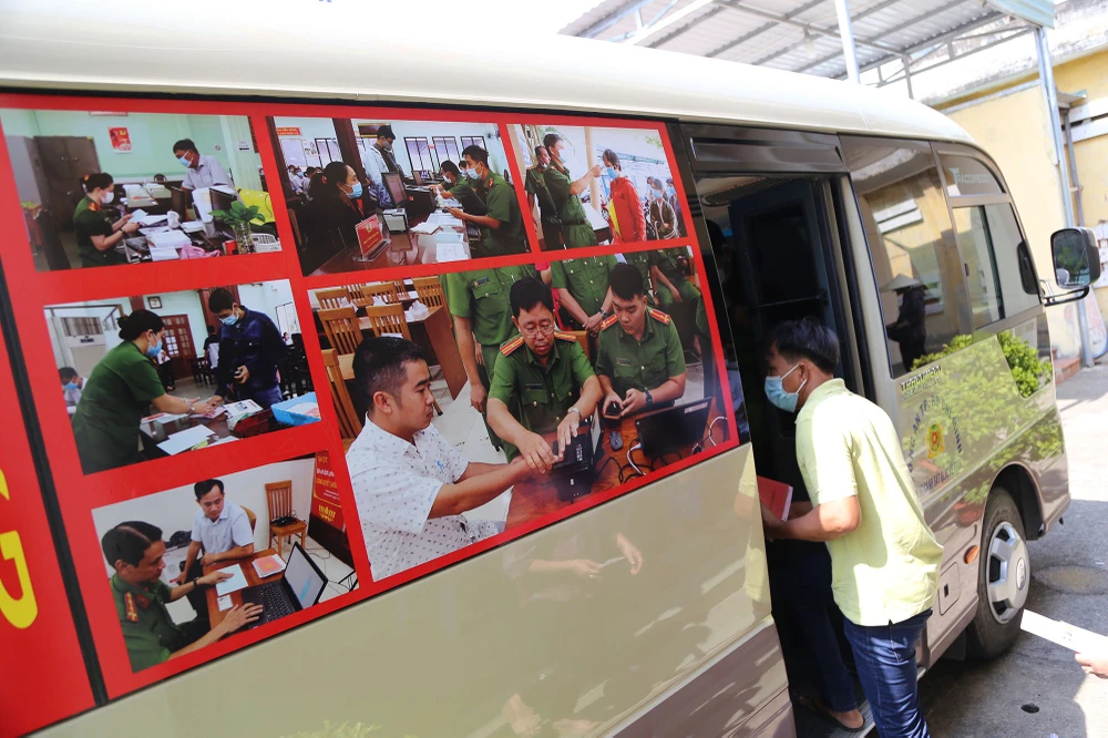 Sáng 19-3, xe làm căn cước công dân gắn chip điện tử lưu động của Phòng cảnh sát quản lý hành chính về trật tự xã hội Công an TP.HCM tiếp tục làm căn cước cho người dân ngay tại khu phố 4, phường Linh Xuân, TP Thủ Đức.