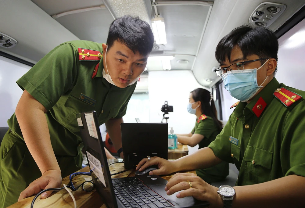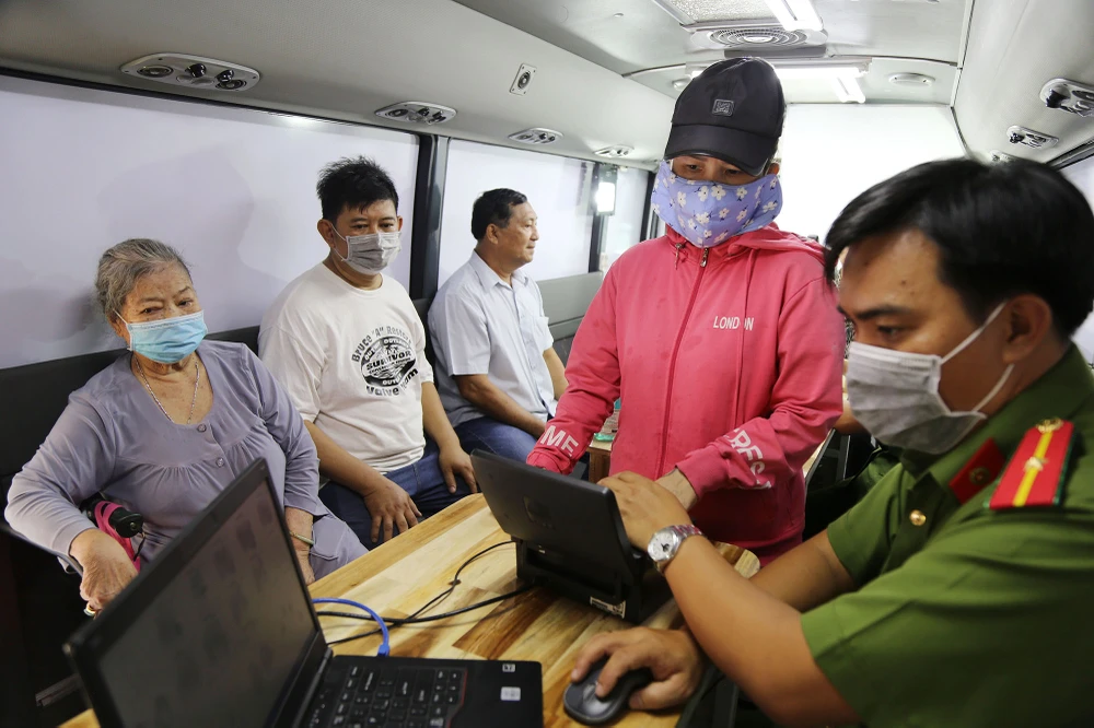Cán bộ phòng cảnh sát quản lý hành chính về trật tự xã hội Công an TP.HCM thu thập thông tin của người dân làm căn cước công dân.