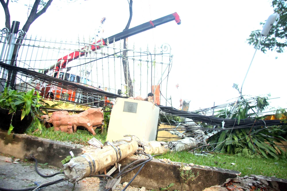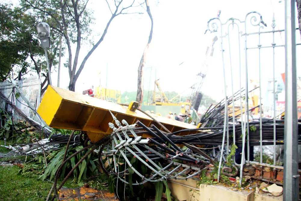Ghi nhận tại hiện trường, khoảng 10 mét rào chắn bằng sắt bị chiếc cẩu đánh sập, những bước tượng điêu khắc hư hại. Cây xanh gần đó gãy đôi. Hệ thống dây diện, cáp viễn thông và trụ điện xung quanh cùng cây xanh bị kéo xà xuống nằm ngổn ngang, bị hàng chục tấn sắt đè lên.
