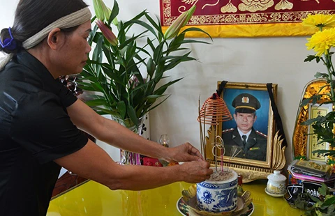 Chị Tô Thị Thoa, vợ anh Hải, xót xa bên bàn thờ chồng. Ảnh: DH