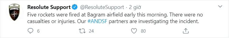 "Năm quả rocket đã nhắm vào căn cứ không quân Bagram trong sáng sớm hôm nay (ngày 9-4). Không có người nào thiệt mạng hay bị thương. Lực lượng An ninh quốc gia Afghanistan (ANDSF) - đối tác của chúng tôi - đang điều tra vụ việc" - phái bộ NATO ở Afghanistan thông báo trên Twitter.