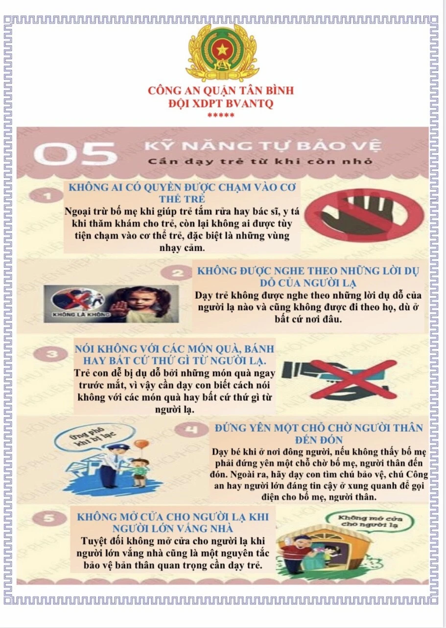 5 kỹ năng tự vệ cần dạy trẻ từ khi còn nhỏ. Nguồn: Công an quận Tân Bình