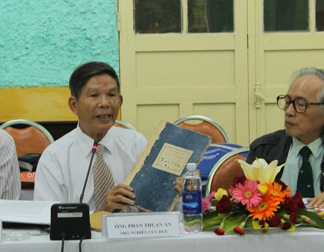 Nhà nghiên cứu Phan Thuận An và tập Châu bản của gia đình để lại. Ảnh: V.Long
