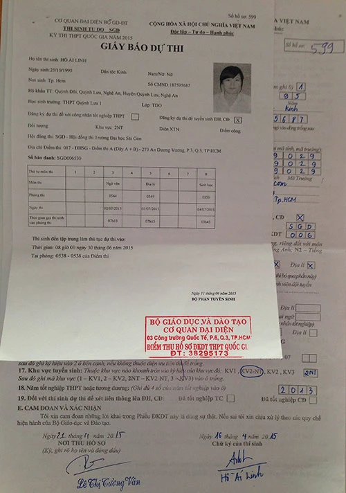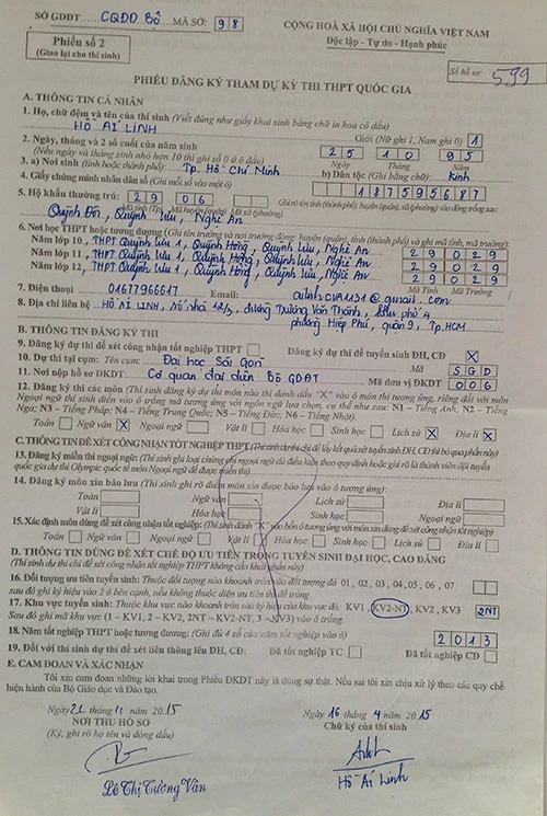 Phiếu đăng kí thí sinh thi khối C (ngữ văn, lịch sử, địa lý) nhưng trong giấy báo thi lại gạt môn lịch sử đưa môn sinh học vào. Ảnh: P.ĐIỀN