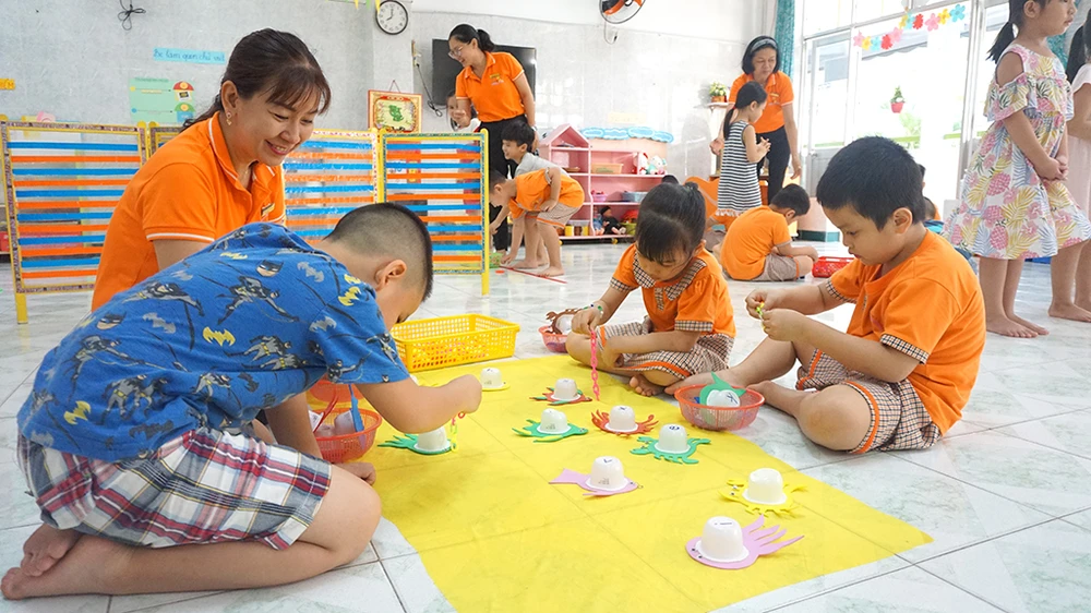 Một tiết học của các bé lớp lá Trường Mầm non Tuổi Thơ 7, quận 3, TP.HCM. Ảnh: NGUYỄN QUYÊN