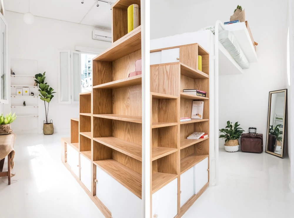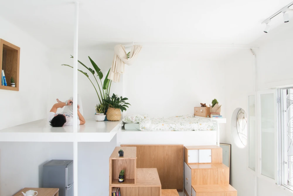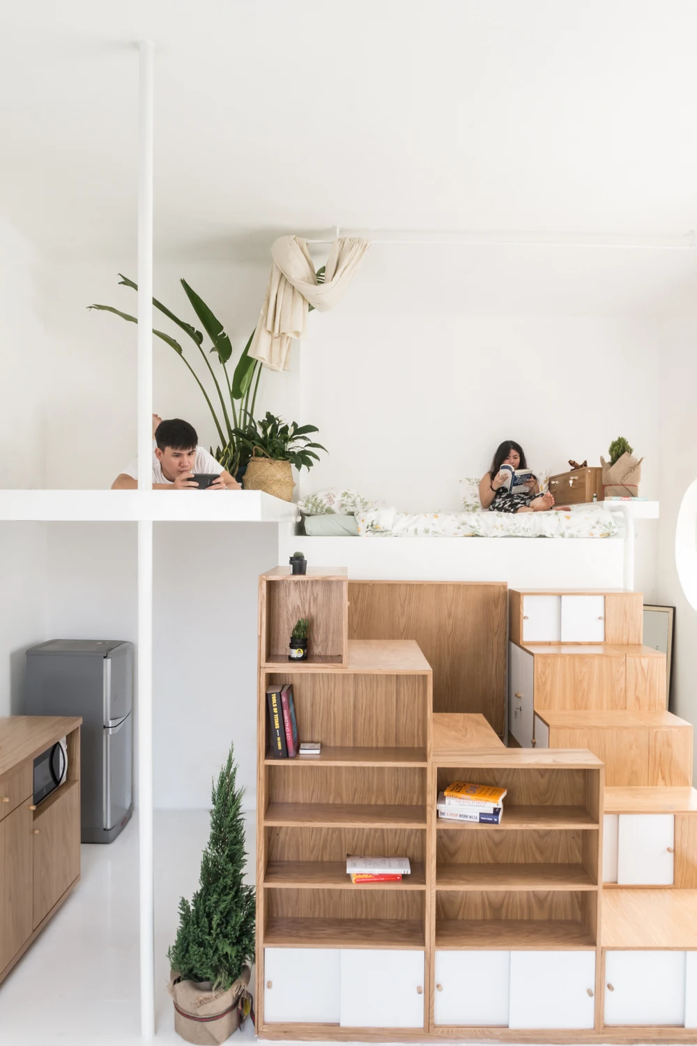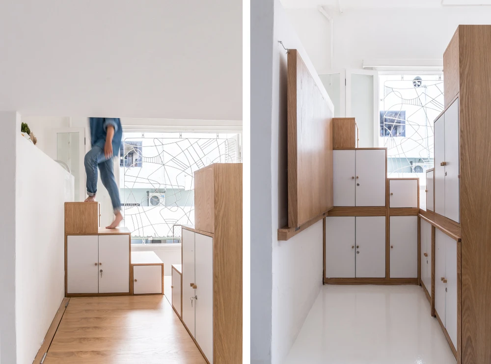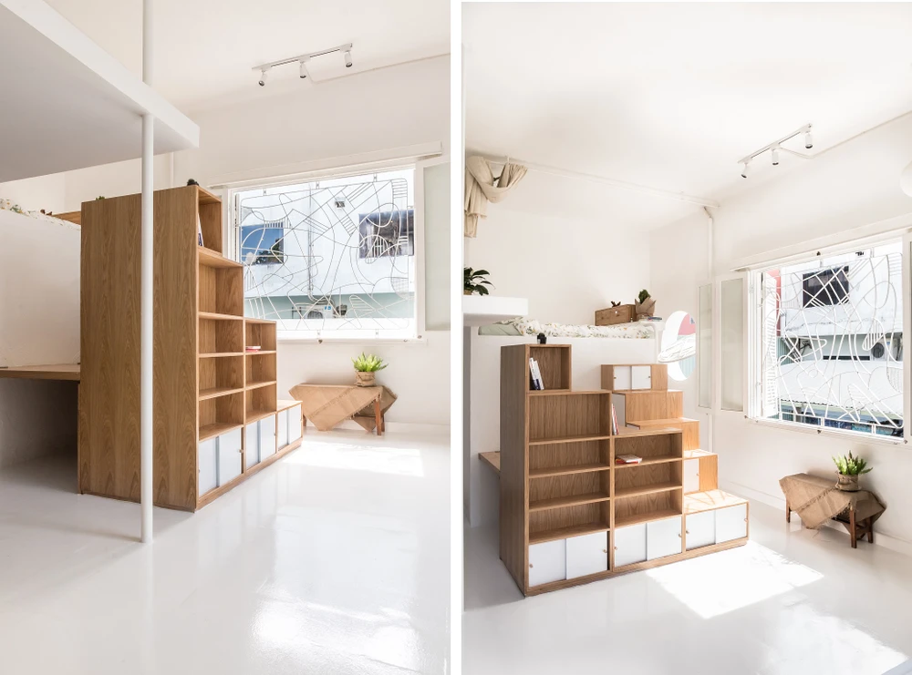 Việc tận dụng độ cao trần 3,5 m hiện hữu kết hợp với các cao độ khác nhau của hệ sàn lửng phụ trợ giúp người sử dụng vẫn đảm bảo sự thoải mái.