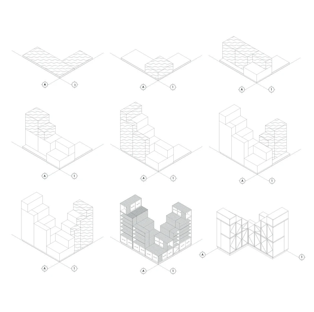 Các sàn lửng đa chức năng được bố trí ở cao độ phù hợp và liên kết với nhau thông qua hệ cầu thang đa dụng. Mặt ngoài là kệ trưng bày, mặt trong là kho và sàn phụ trợ.