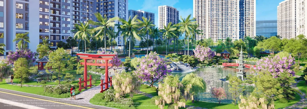 Theo đó, Vinhomes đã đầu tư tỉ mỉ cho không gian vườn Nhật với hồ cá Koi vốn yêu cầu kỹ thuật nuôi phối tương đối cao, các đồi cảnh quan Tùng La hán có giá trị vô cùng lớn. Toàn bộ tiểu cảnh như đường dạo uốn lượn, cầu gỗ, cầu đá, cổng Torii… được sắp đặt bởi chính đội ngũ nghệ nhân lành nghề từ Nhật Bản.