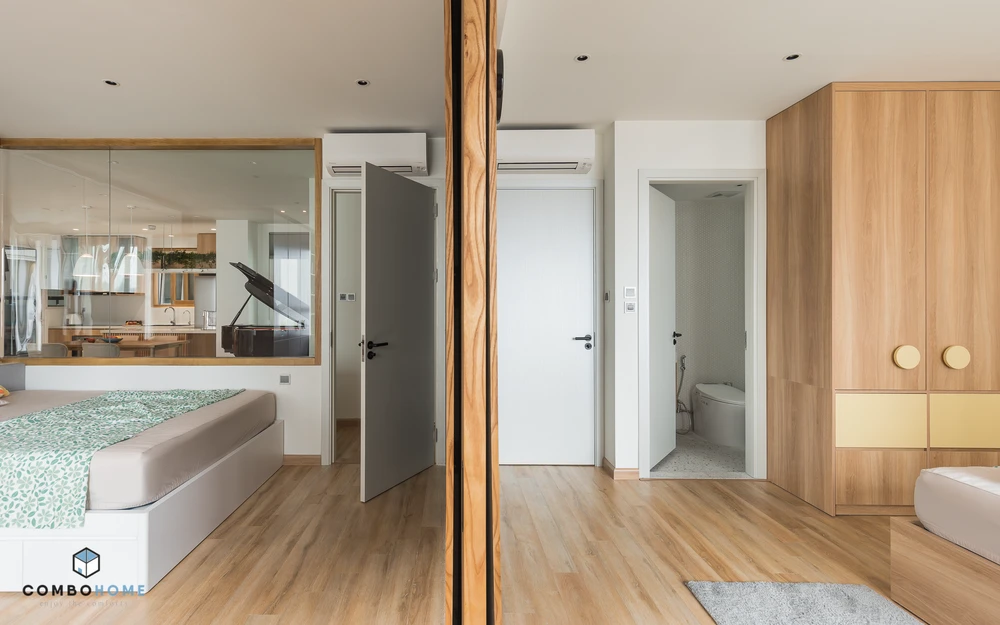 Mỗi phòng ngủ đều có cửa phòng riêng, tuy nhiên vách tường ngăn cách giữa phòng hai cô con gái và gia chủ là cánh cửa lùa linh hoạt.