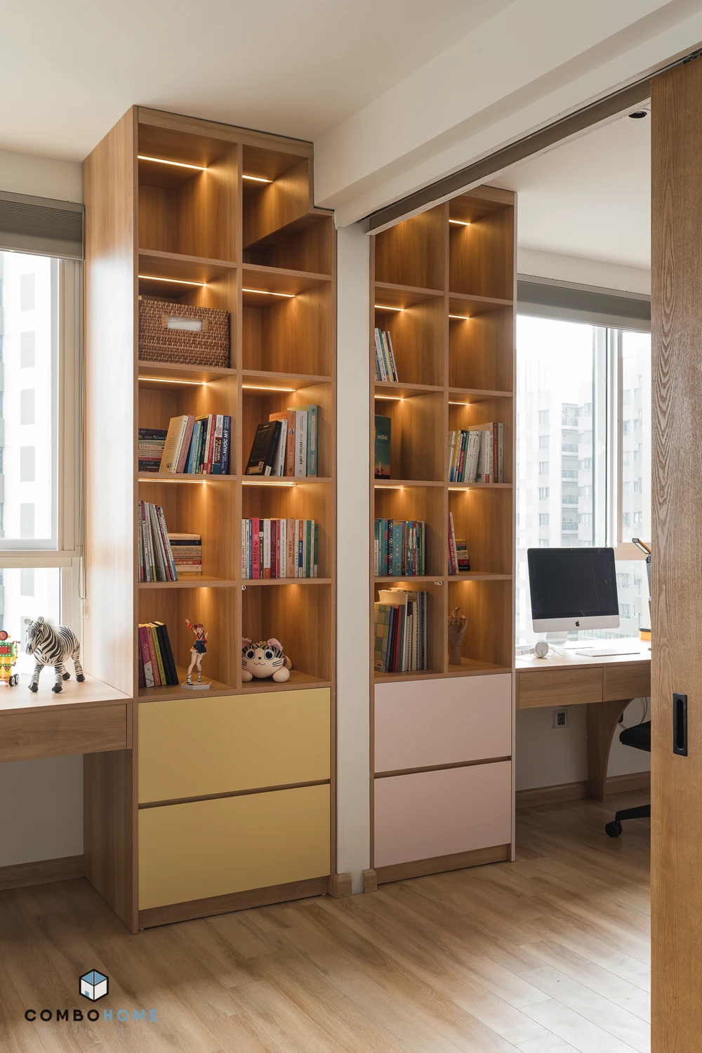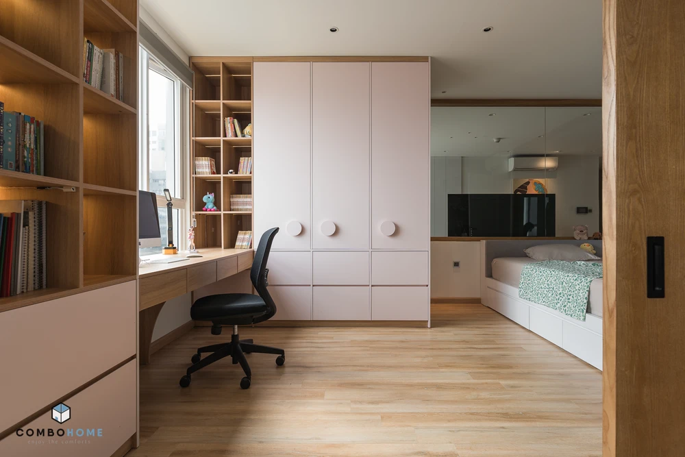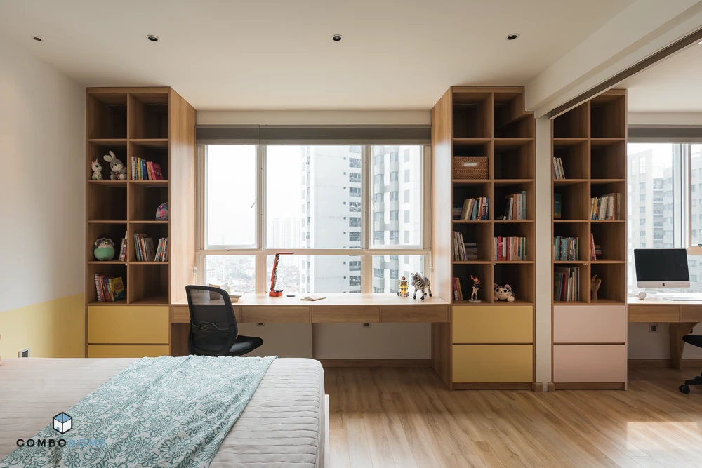 Góc học tập và làm việc của ba mẹ và con gái nối dài với nhau.