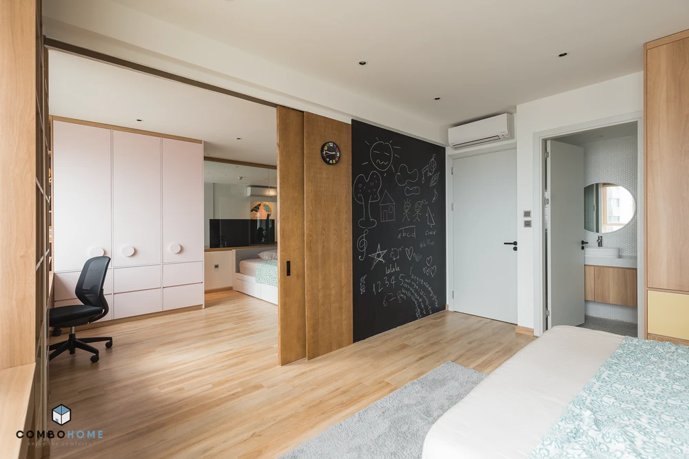 Phòng hai em bé được đập bỏ bức tường thay vào đó bằng hệ cánh cửa lùa khi vui chơi có thể kéo và mở rộng không gian.