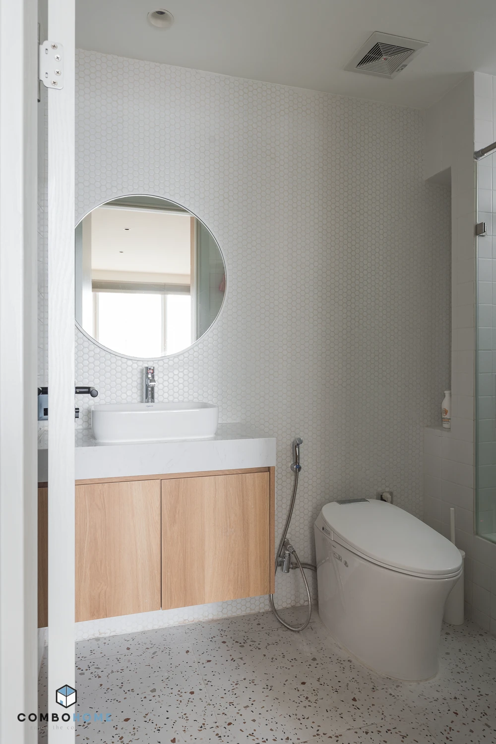 Phòng vệ sinh sử dụng gạch mosaic màu trắng và gạch vuông giúp không gian ngăn nắp hơn, đồng điệu với gạch ốp bếp.