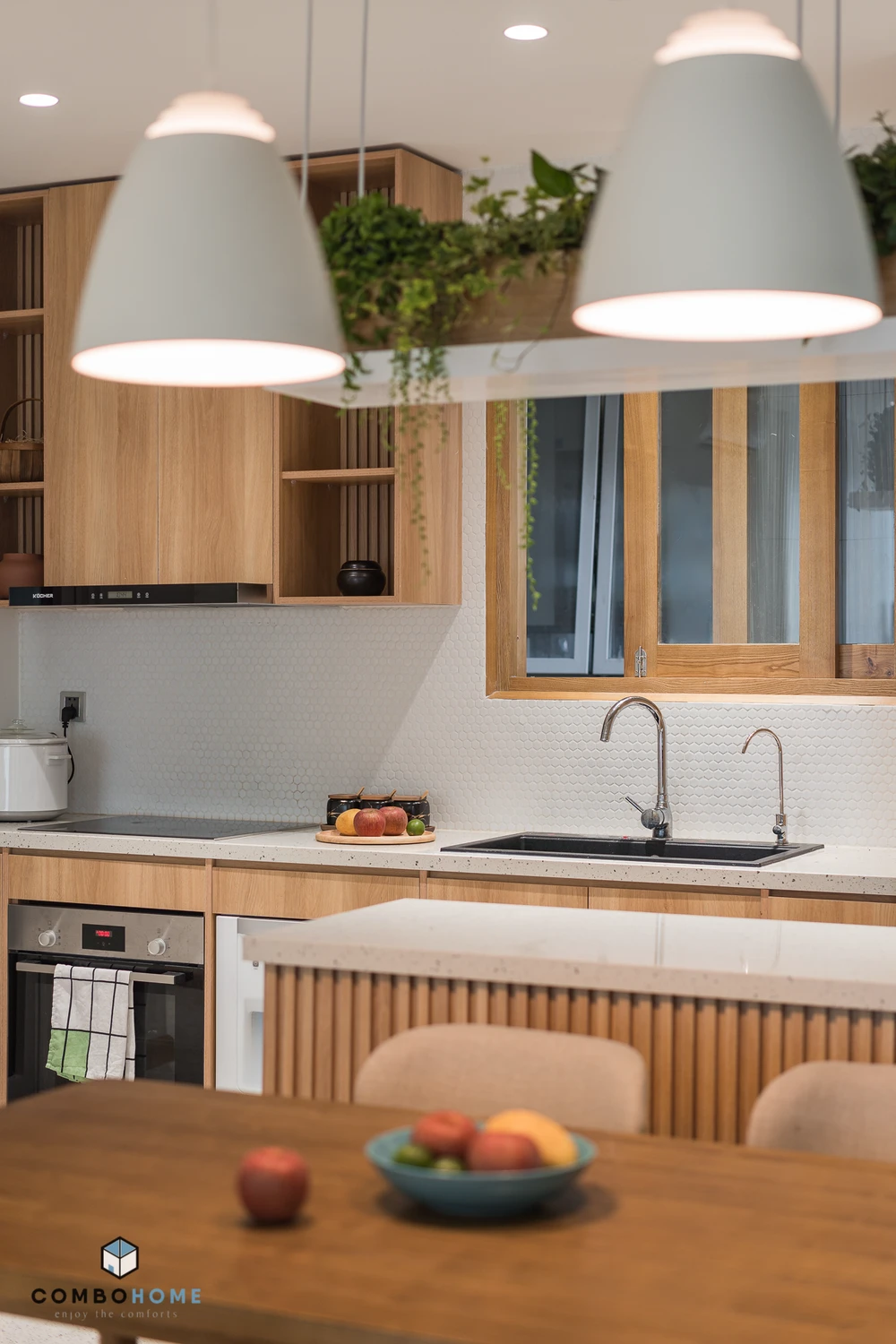 Kiến trúc sư Combo Home đã thiết kế và đập bỏ những bức tường bếp để mở không gian, tạo đường cong ở sàn bếp.