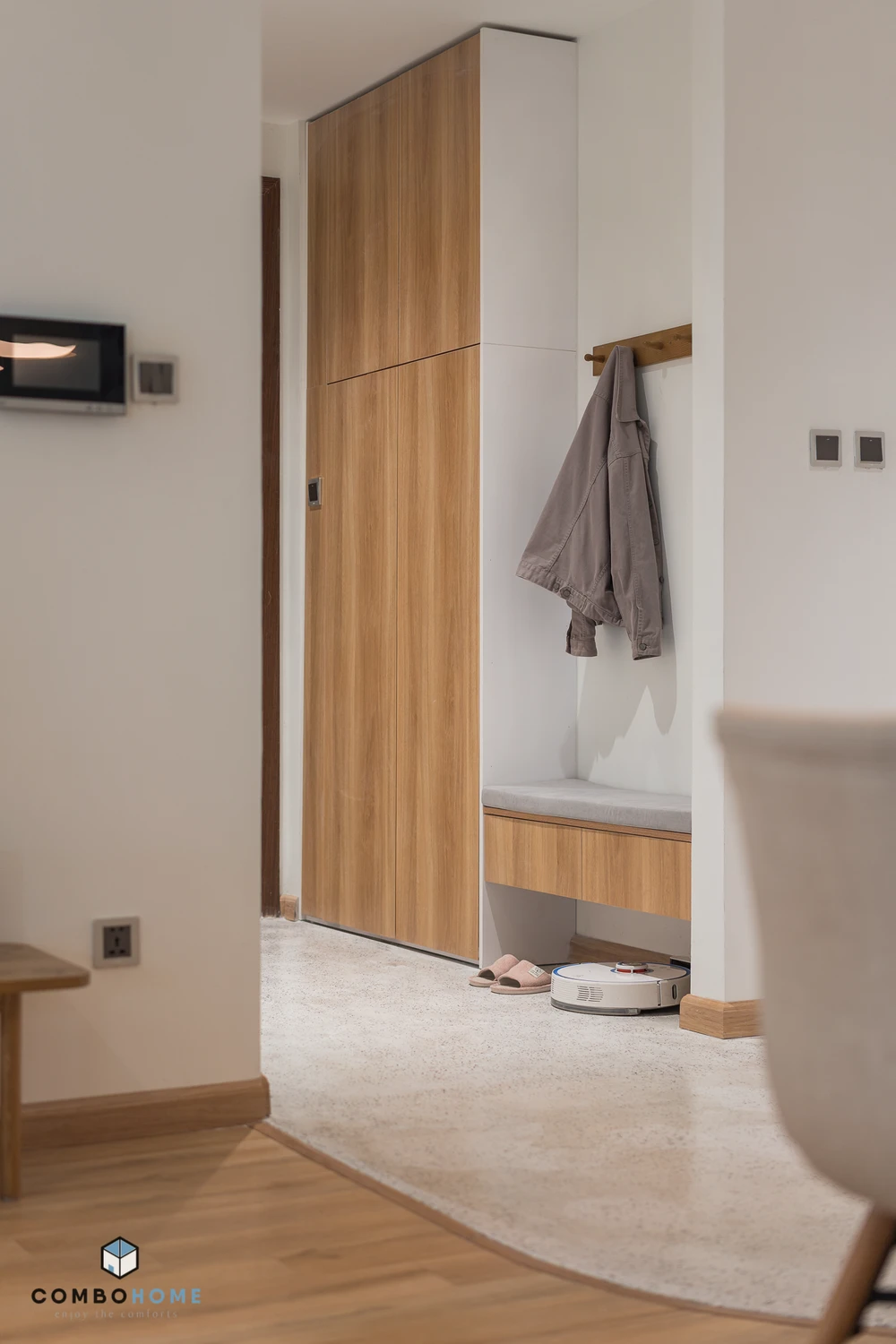 Vật liệu trong nhà sử dụng gỗ và màu trắng làm không gian giản dị, mộc mạc hơn.
