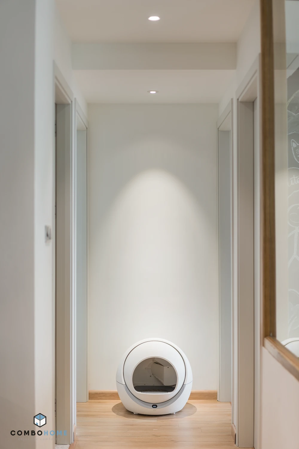 Ngăn cách phòng khách và khu vực phòng ngủ là vách ngăn bằng kính trong suốt.