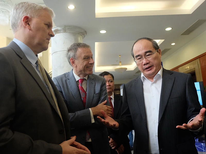 Bí thư Thành ủy TP.HCM Nguyễn Thiện Nhân trao đổi với các nhà đầu tư tại hội nghị. Ảnh: TÁ LÂM