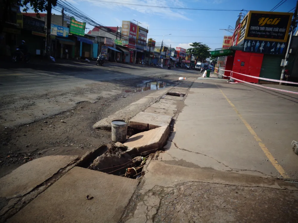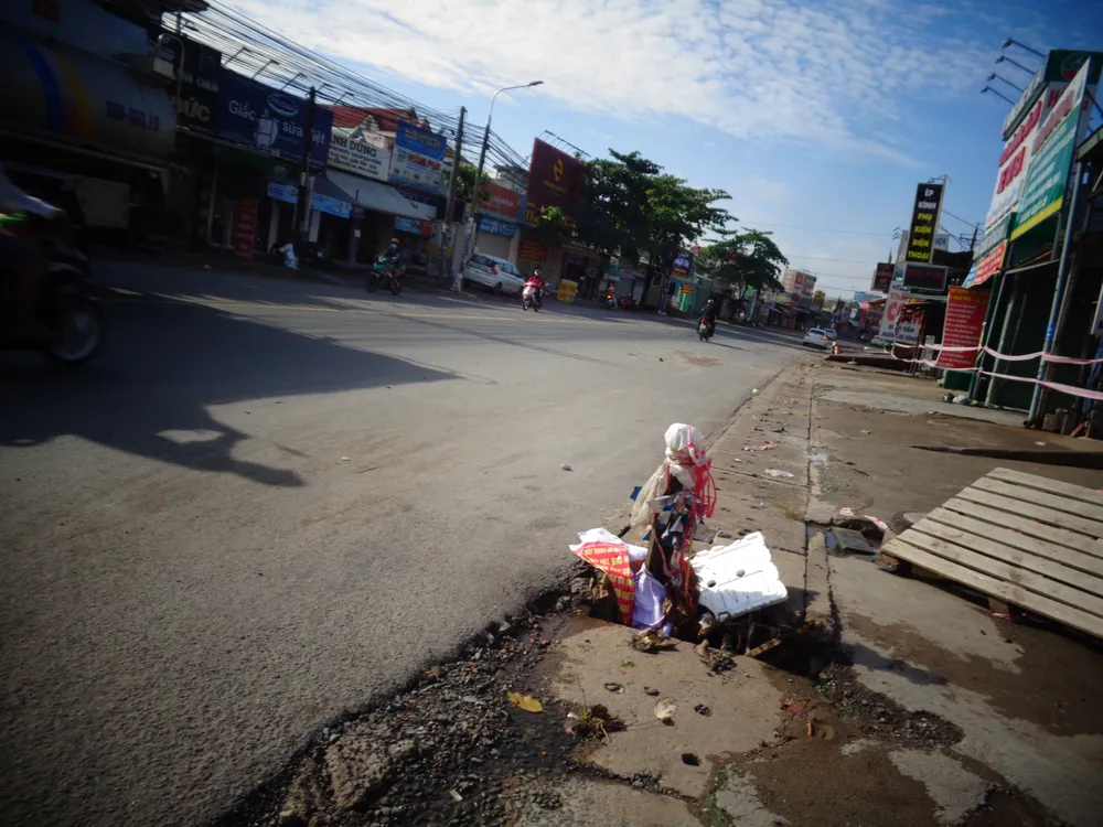 Ảnh chụp ngày trên đường Bùi Văn Hòa, khu phố 3, phường Long Bình Tân, TP Biên Hòa, tỉnh Đồng Nai. Đoạn đường dài khoảng 50m nhưng có tới ba nắp mương đã hỏng nhiều tạo thành những hố nguy hiểm cho người và phương tiện tham gia giao thông qua đây, nhất là đoạn gần vòng xoay cổng 11 vốn phức tạp. Người dân nơi đây dùng vật liệu chắn tạm để cảnh báo.