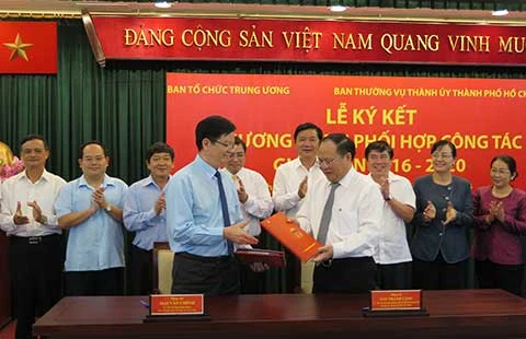 Lễ ký kết chương trình phối hợp công tác giữa Ban Tổ chức Trung ương với Ban Thường vụ Thành ủy TP.HCM. Ảnh: TÁ LÂM
