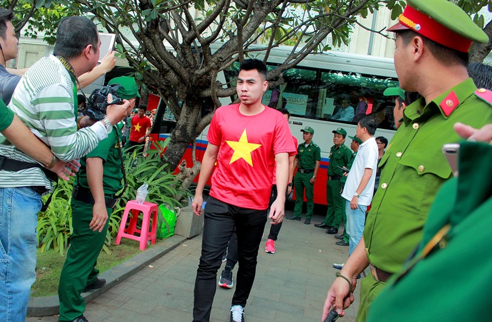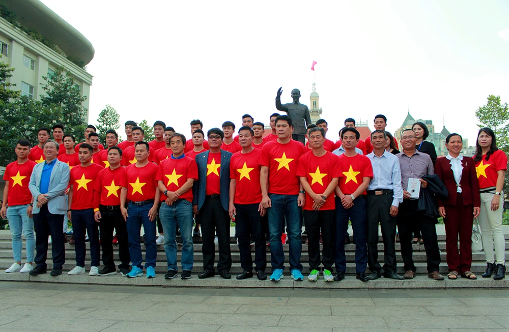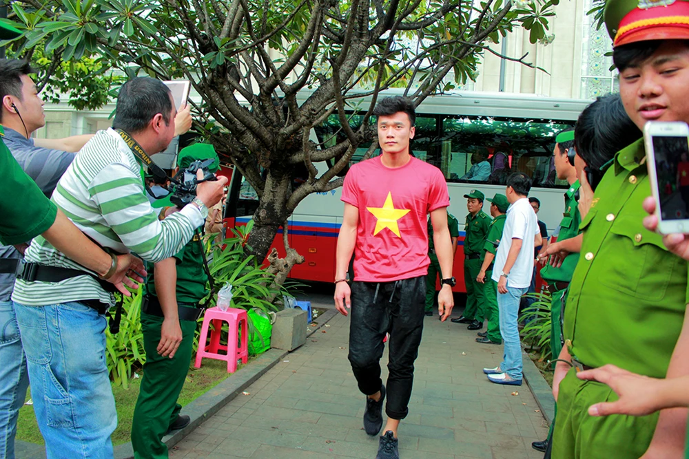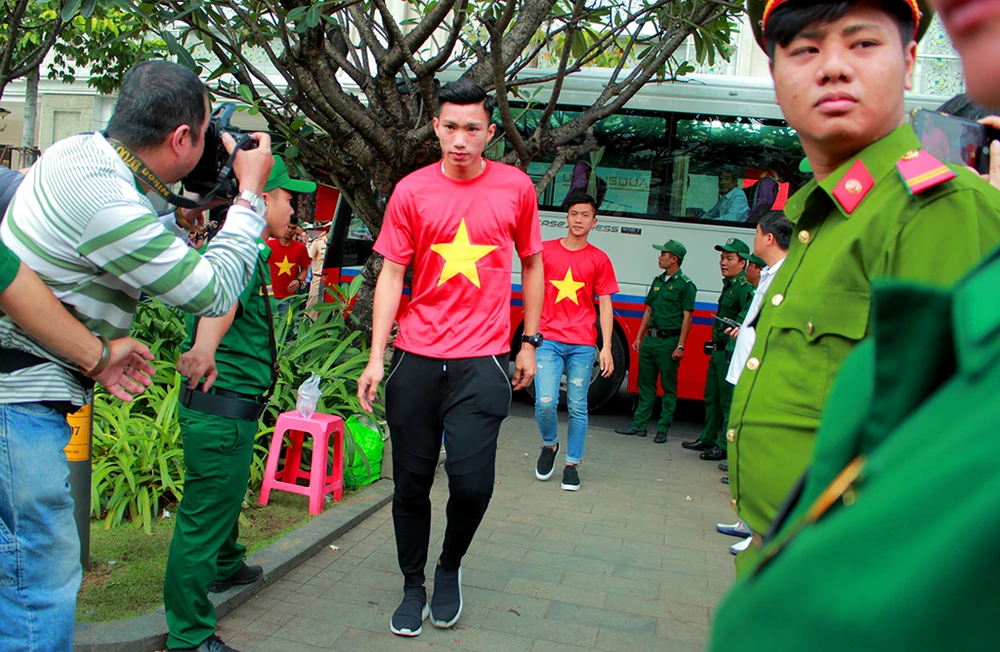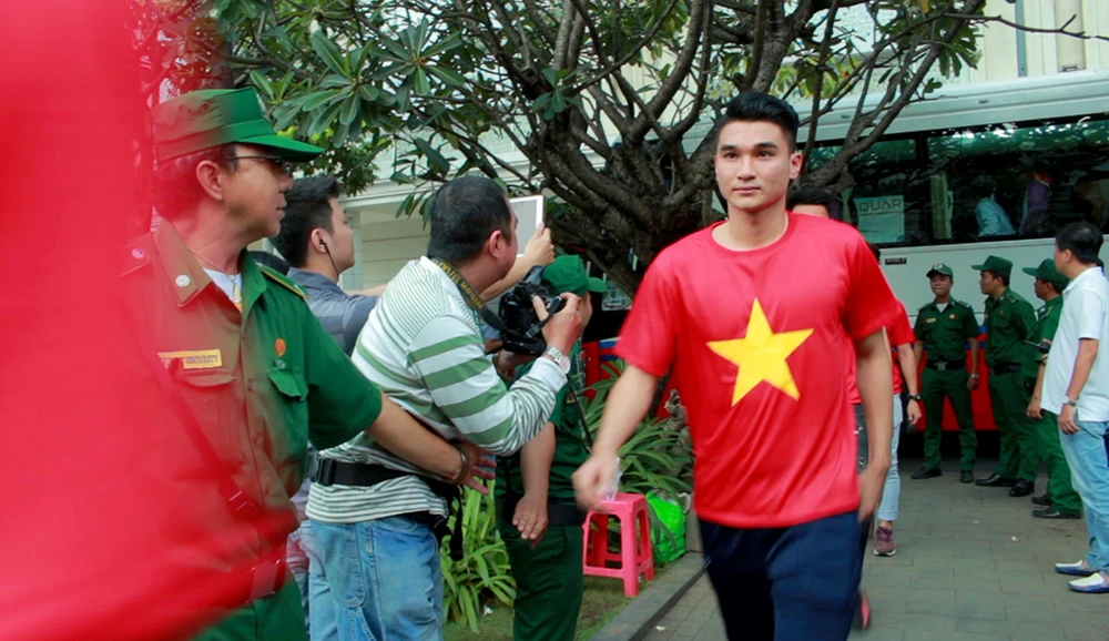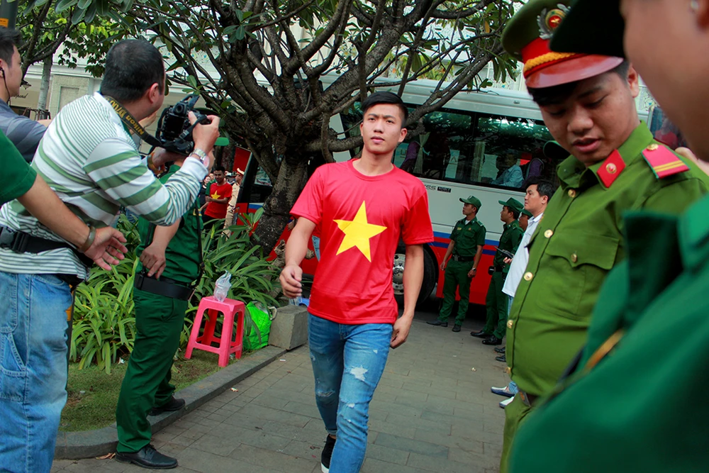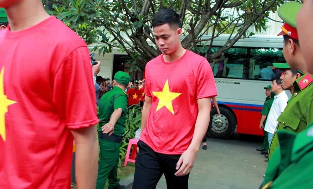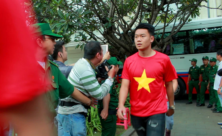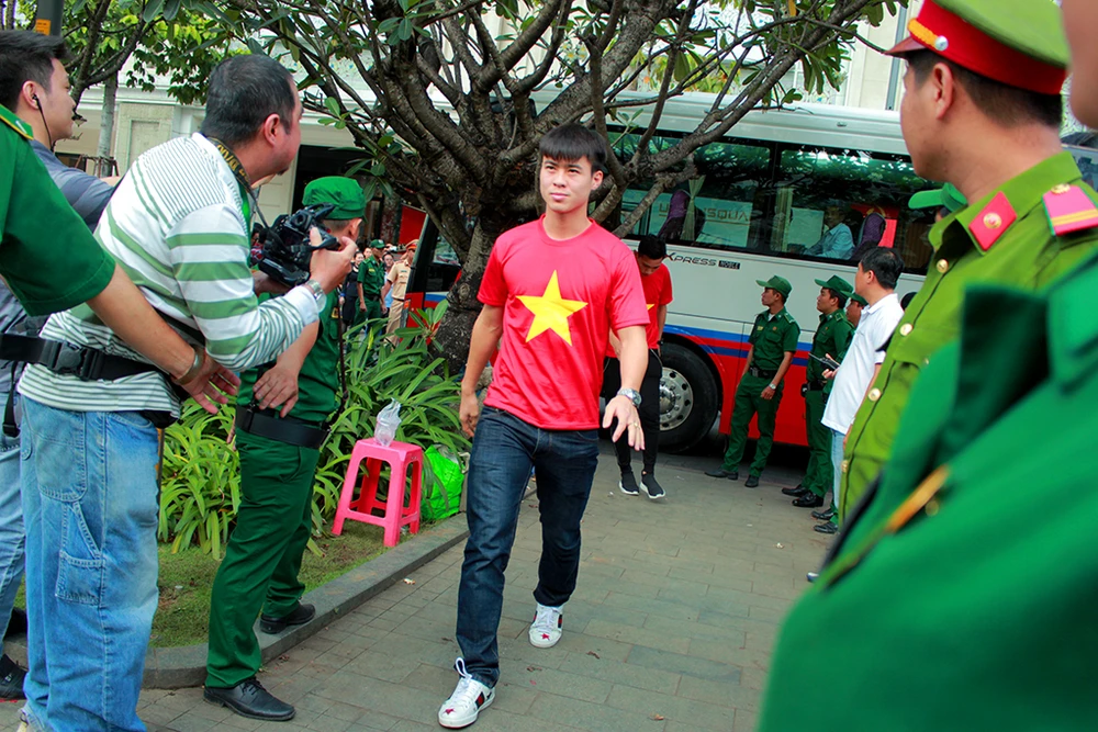 Trong màu áo cờ đỏ sao vàng, từng thành viên bước xuống xe di chuyển vào khu vực làm lễ trong tiếng hò reo không ngớt của người hâm mộ.