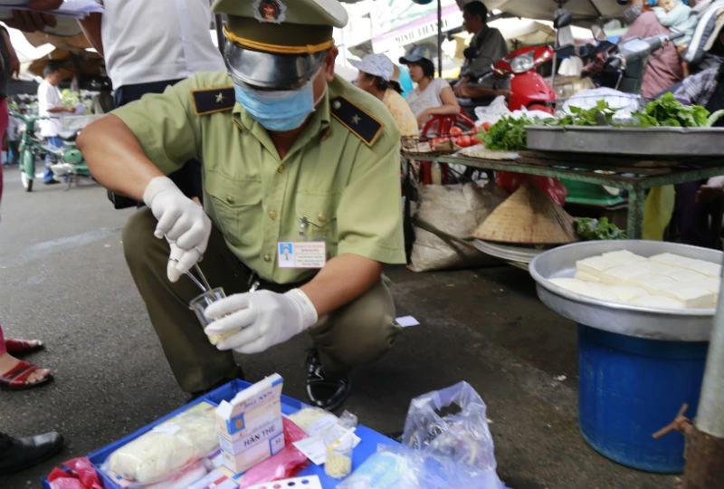Lực lượng chức năng lấy mẫu để kiểm tra chất lượng thực phẩm.