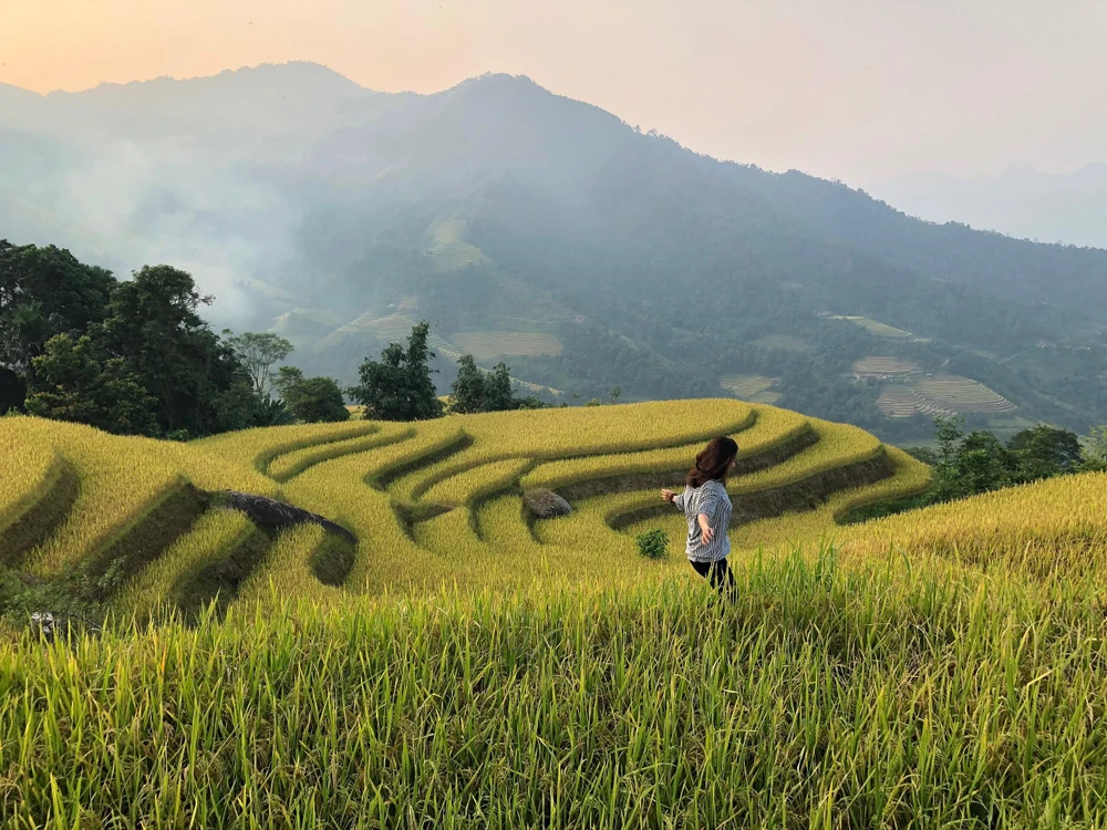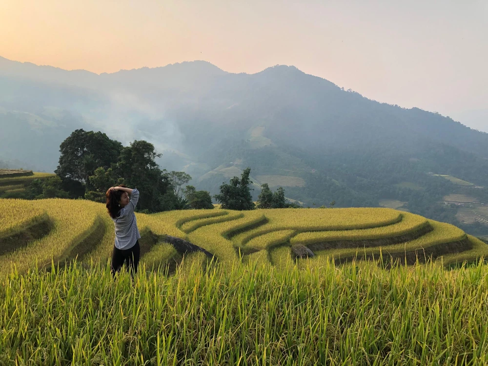 “Giấc mơ được tận mắt chiêm ngưỡng ruộng bậc thang vào mùa lúa chín vàng đã thành hiện thực. Thật là mãn nhãn. Vẻ đẹp vượt sức tưởng tượng của Cúc. Những mảng màu đan xen, thửa ruộng bậc thang trải dài lượn sóng, con người thân thiện, vui vẻ… là những gì Cúc ghi lại trong tâm trí. Cứ muốn ngồi mãi hít hà hương lúa, hương núi đồi…” - Kim Cúc nói.