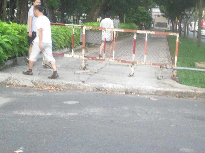 Rào chắn có chừa lối nhỏ chỉ đủ cho một người đi gây khó khăn cho người đi trên vỉa hè này, nhất là người dân tập thể dục đi theo nhóm, đồng thời gây phản cảm.