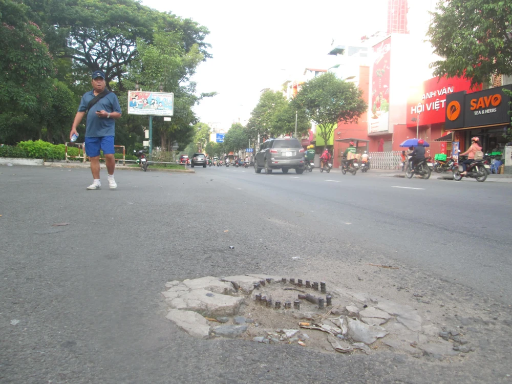 Cũng ngay giữa cổng Công viên Lê Văn Tám này có “bàn chông” nguy hiểm. Trụ điện án ngữ giữa cổng ra vào đã được dẹp bỏ nhưng cơ quan chức năng lại chừa chân đế với nhiều thanh sắt gây nguy hiểm cho người dân đi tập thể dục cũng như người tham gia giao thông.