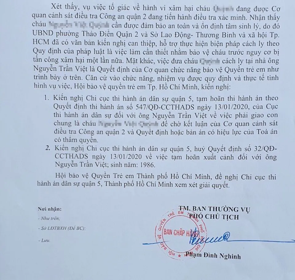 Chiều 15-1, ông Phạm Đình Nghinh, Phó Chủ tịch Hội Bảo vệ quyền trẻ em TP.HCM, đã ký Công văn 02/2020 gửi Chi cục Thi hành án dân sự quận 5 (TP.HCM) về việc can thiệp hỗ trợ khẩn cấp đối với trẻ có nguy cơ bị xâm hại.