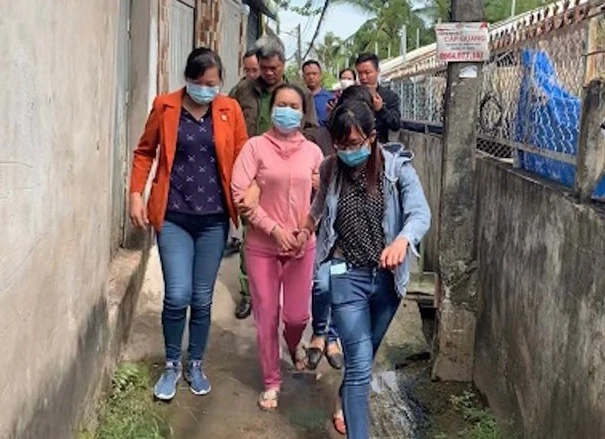 Công an thi hành lệnh bắt bị can Lê Thị Bình (áo hồng) tội lợi dụng các quyền tự do... hồi 22-12-2020. Ảnh: CACC