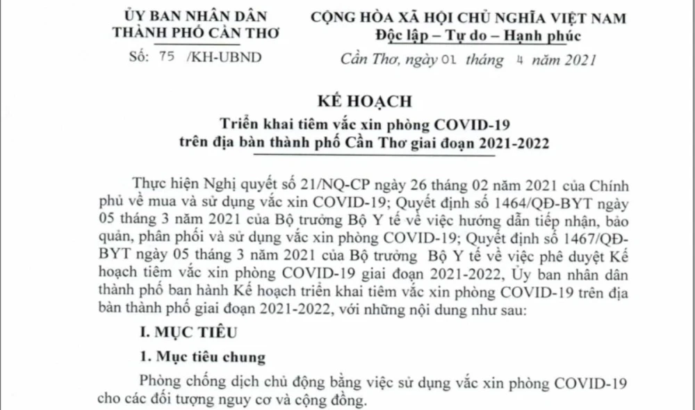 Ngày 1-4, UBND TP Cần Thơ đã ban hành kế hoạch triển khai tiêm vaccine phòng COVID-19 trên địa bàn TP Cần Thơ giai đoạn 2021-2022.