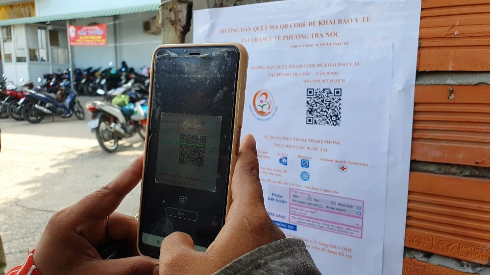 Người dân Cần Thơ quét mã QR code để khai báo y tế. Ảnh: CHÂU ANH