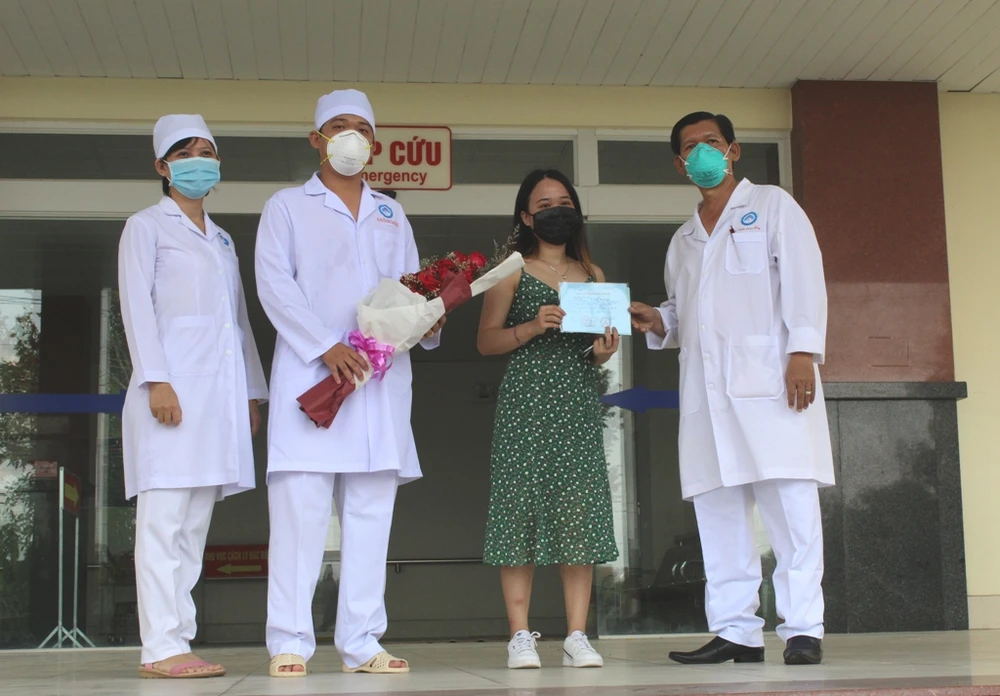 Giám đốc BV Lao và Bệnh phổi TP Cần Thơ Trần Mạnh Hồng trao giấy ra viện cho chị NTT. Ảnh: NHẪN NAM