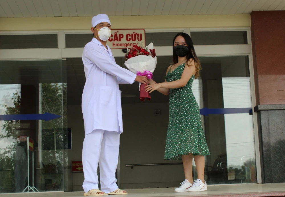 Chị NTT tặng hoa cám ơn các bác sĩ BV Lao và Bệnh phổi đã điều trị khỏi bệnh cho mình. Ảnh: NHẪN NAM