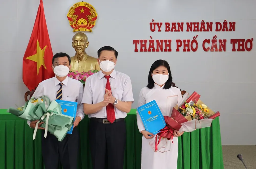 Phó Chủ tịch UBND TP Cần Thơ Dương Tấn Hiển trao các quyết định bổ nhiệm đối với các ông, bà Nguyễn Ngọc Việt Nga và Nguyễn Văn Phúc. Ảnh: ĐT