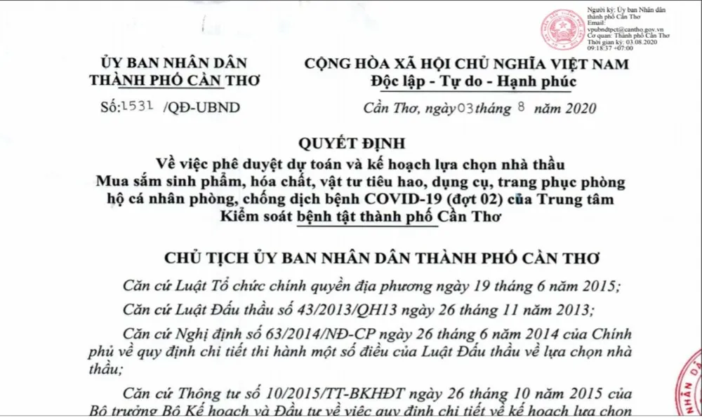 Quyết định của UBND TP phê duyệt mua sắm sinh phẩm, hóa chất... phòng dịch gần 3,9 tỉ của TP Cần Thơ. Ảnh: NHẪN NAM