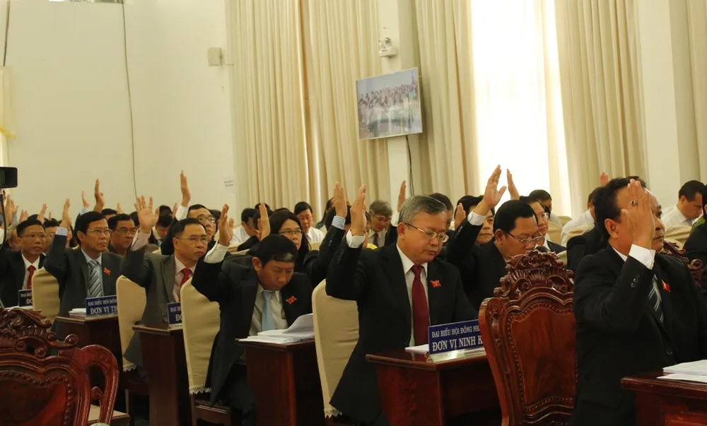 Các đại biểu đã biểu quyết thông qua nghị quyết về thu hồi đất 14 dự án và hai dự án chuyển mục đích sử dụng đất trồng lúa (dưới 10 ha). Ảnh: NHẪN NAM