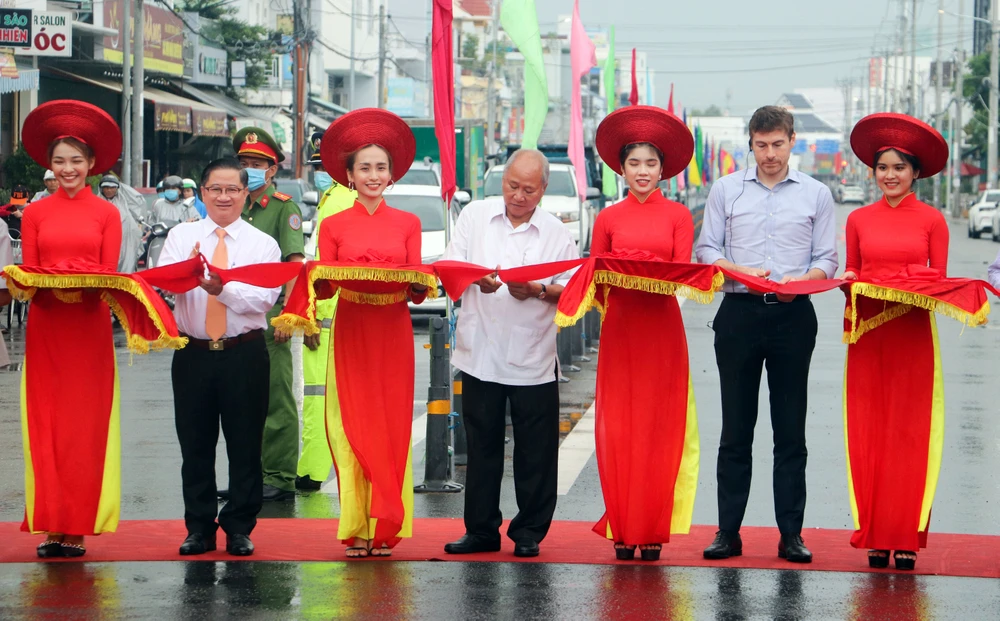 Các đại biểu thực hiện nghi thức cắt băng thông xe đường Trần Hoàng Na. Ảnh: CHÂU ANH